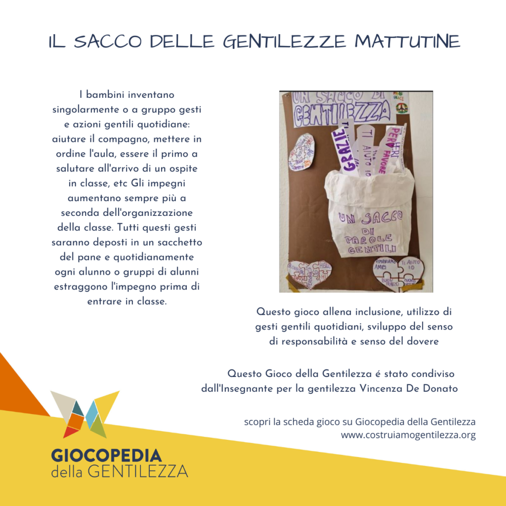 I bambini inventano singolarmente o a gruppo gesti e azioni gentili quotidiane: aiutare il compagno, mettere in ordine l’aula, essere il primo a salutare all’arrivo di un ospite in classe, donare il biglietto pescato ad un compagno per un saluto particolare, distribuire quaderni, fotocopie, accompagnare il compagno fuori ai servizi se non si sente tanto bene, chiudere la porta quando viene lasciata aperta, dare supporto a chi non riesce ancora a scrivere i compiti per casa sul diario, aiuta la maestra a far uscire a turno i compagni durante la merenda, supportare i compagni che litigano cercando un modo per far pace, etc Gli impegni aumentano sempre più a seconda dell’organizzazione della classe. Tutti questi gesti saranno deposti in un sacchetto del pane e quotidianamente ogni alunno o gruppi di alunni estraggono l’impegno prima di entrare in classe.