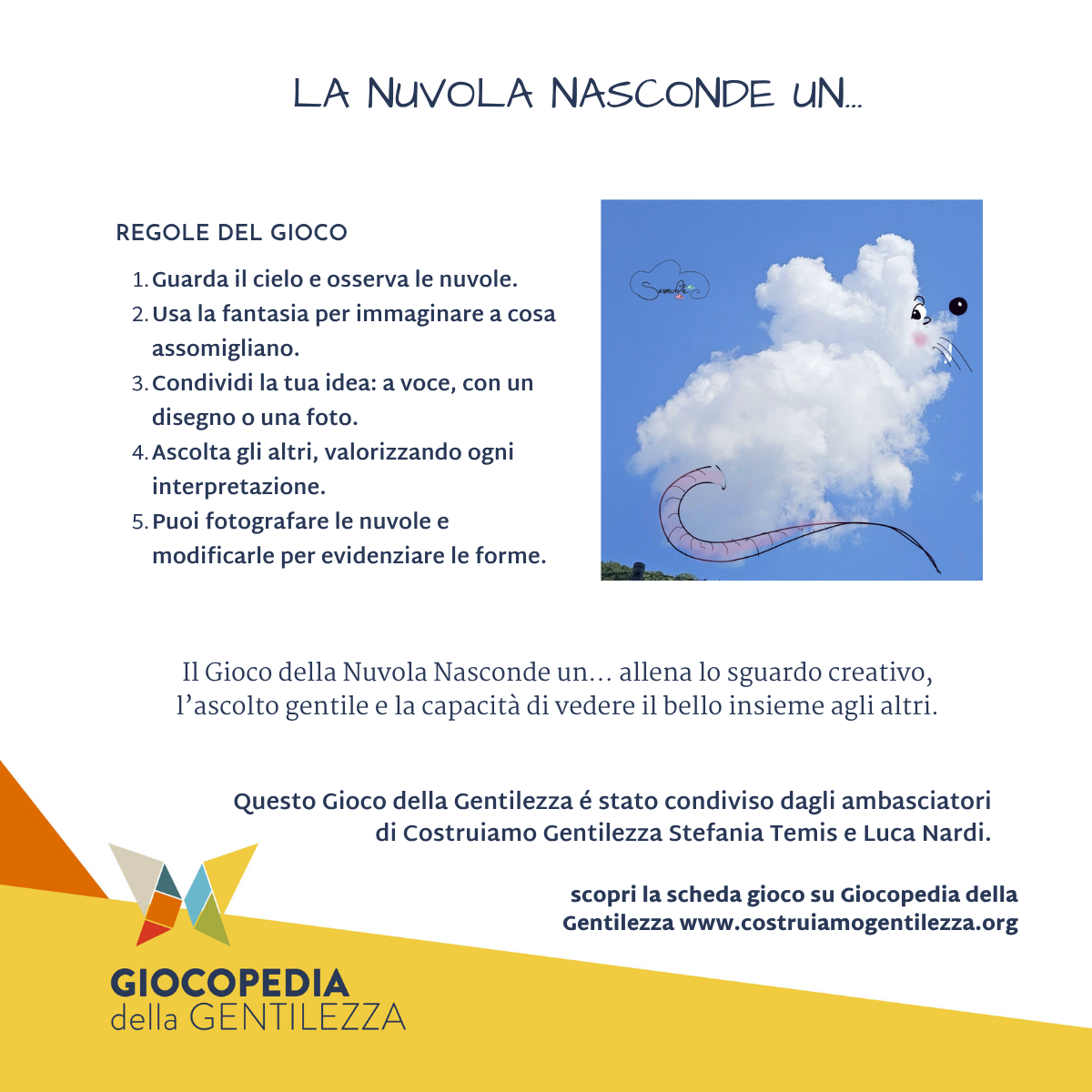 Osserva il cielo, individua una nuvola dalla forma curiosa e immagina a cosa somiglia. Condividi la tua visione con gli altri, ascolta le loro interpretazioni e, se vuoi, disegna o fotografa la nuvola evidenziandone i contorni.