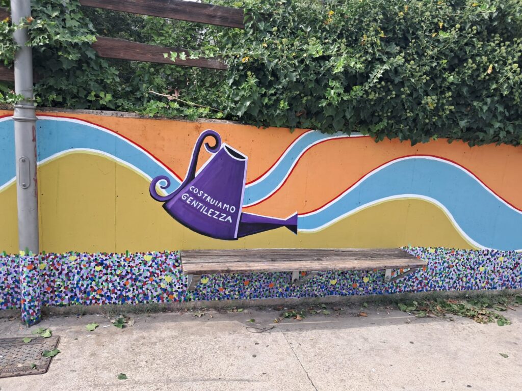 Cosa Rappresenta il Murales: Il disegno rappresenta un annaffiatoio da cui sgorga l’acqua che va su uno strato di fiori variopinti, metaforicamente la gentilezza porta nutrimento all’anima delle persone. L’opera è anche un modo per la comunità di esprimere il proprio pensiero gentile, infatti nel flusso dell’acqua sono state scritte frasi come: “fai una carezza”, “aiuta i ragazzi speciali” “Ascolta”