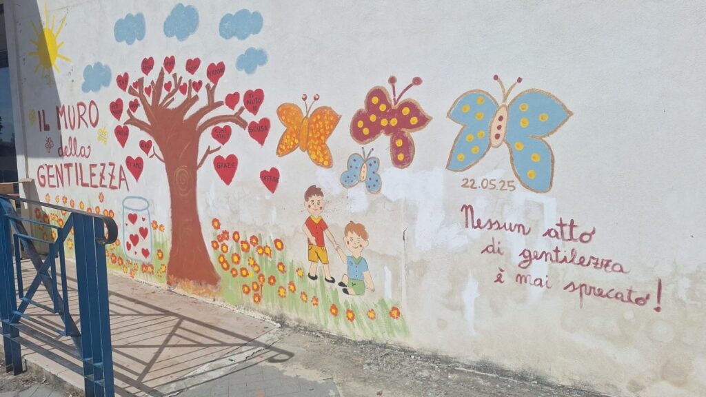 Descrizione Murales: Il “Muro della Gentilezza” è stata un’esperienza creativa e significativa, nata per promuovere i valori del rispetto, dell’empatia e dell’aiuto reciproco. Attraverso disegni colorati, frasi gentili e simboli positivi, bambini e adulti hanno collaborato per realizzare un messaggio visivo di speranza e umanità. È stato un momento di condivisione, educazione e bellezza, in cui ogni gesto e ogni parola ha contribuito a costruire un ambiente più accogliente e solidale.